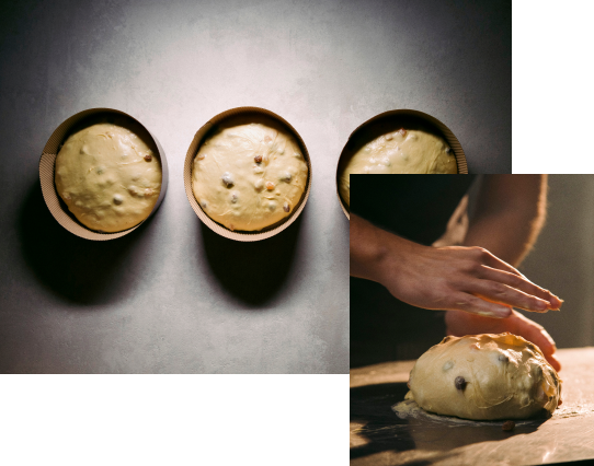 Passate dalle 10 alle 14 ore di lievitazione, al primo impasto ne viene unito un secondo insieme ad agrumi canditi, miele d’acacia, vaniglia e ad una lacrima olio evo, che sostituisce parte del burro per una maggiore digeribilità .