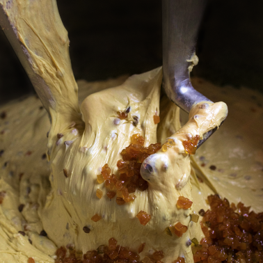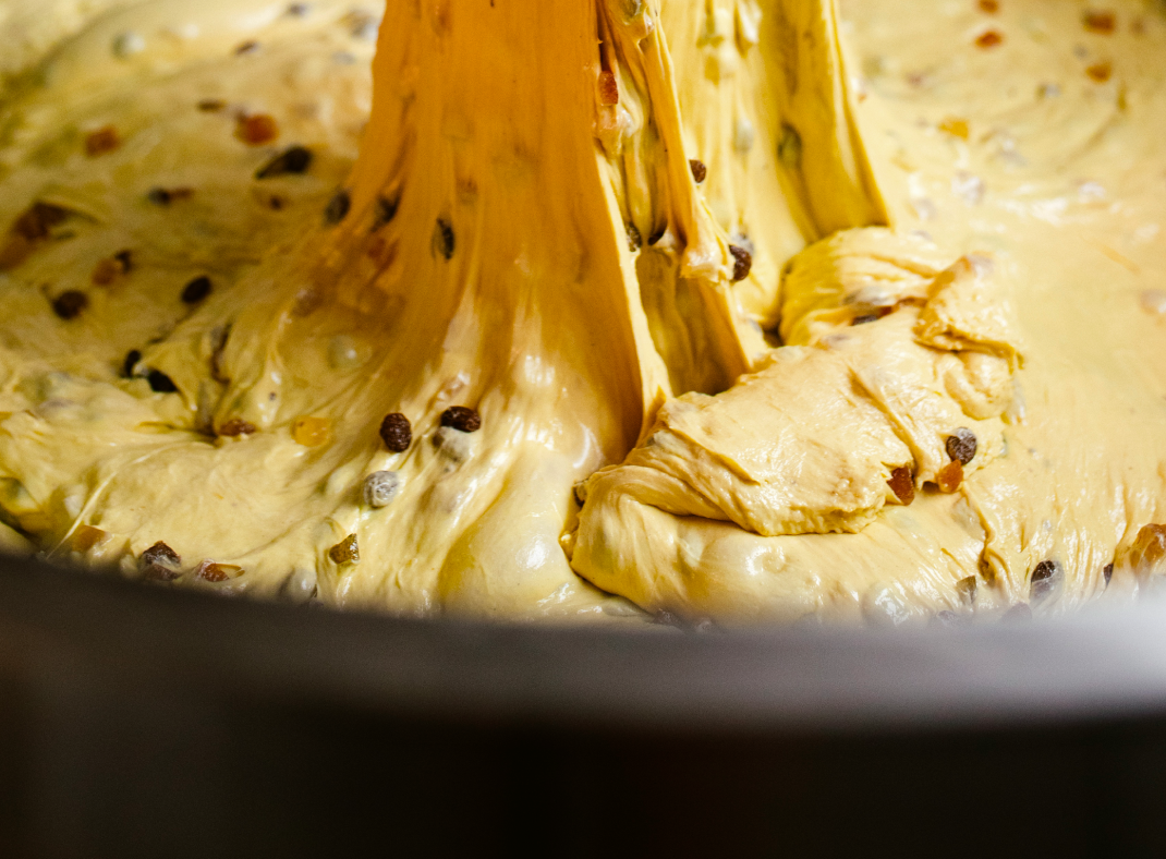 Dopo tre rinfreschi con acqua e farina a distanza di 4 ore ciascuno, il lievito madre viene lavorato lentamente dall’impastatrice a bracci tuffanti insieme al burro, allo zucchero, alla panna e ai tuorli d’uovo fino ad ottenere il primo impasto.